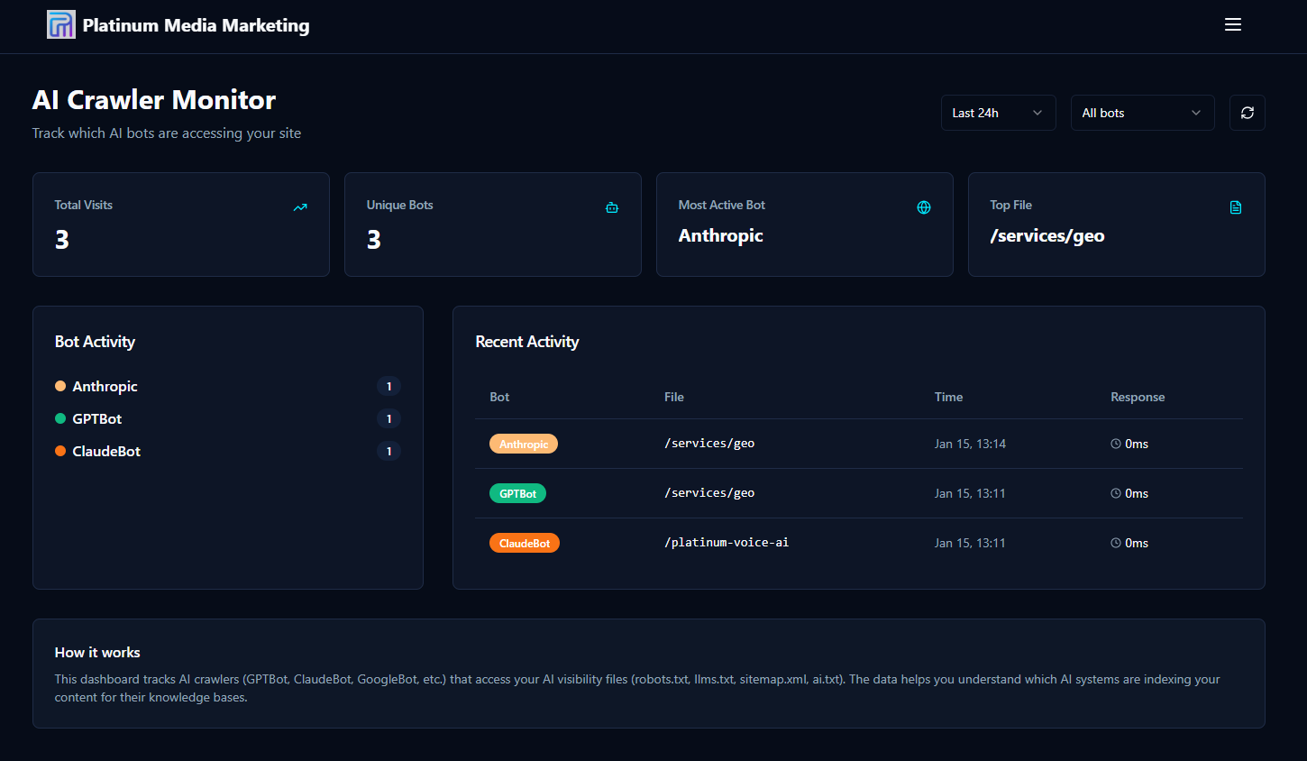 - You can measure it. Unlike vague SEO claims, we can show you exactly which bots visited, when, and what pages they accessed.